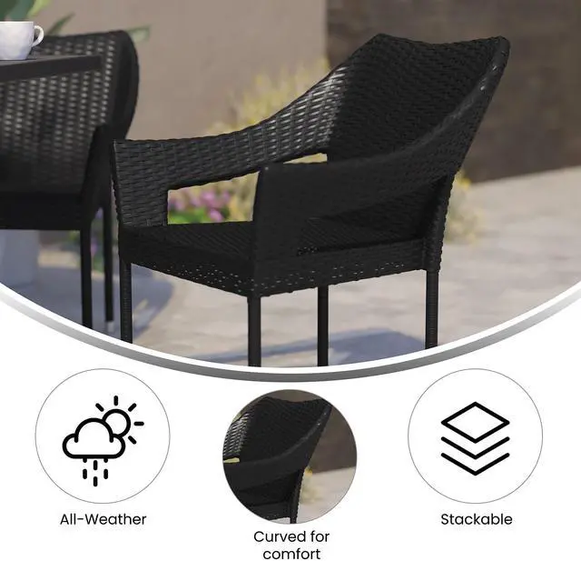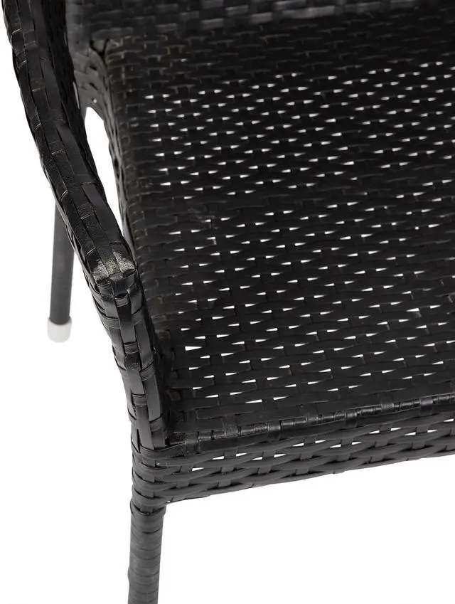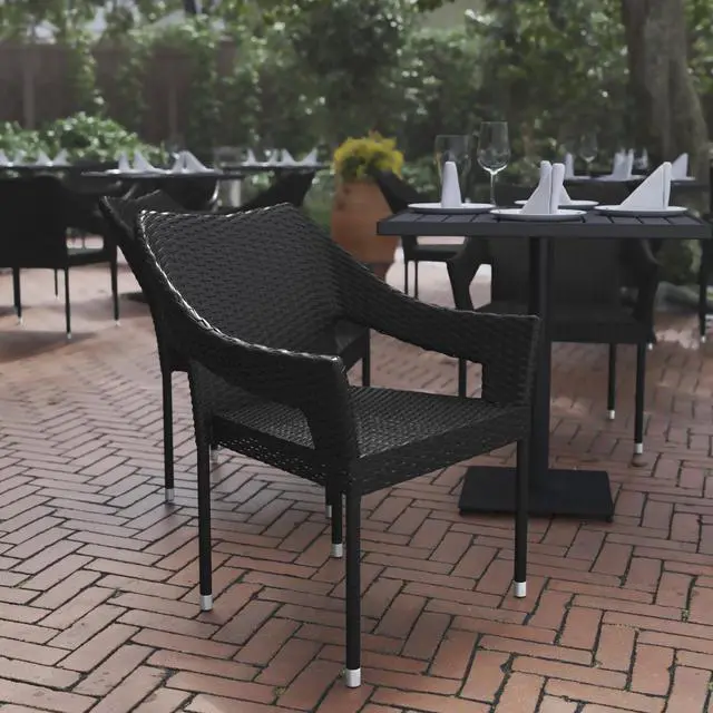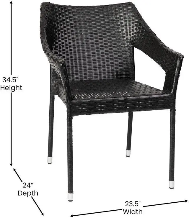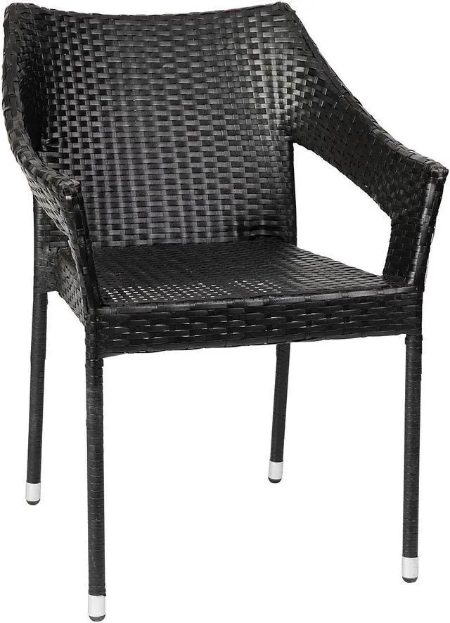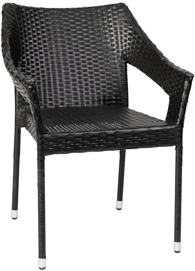Curate an upmarket look at a budget friendly price in your home or business with this stacking patio chair. Featuring a comfortably contoured, all weather PE rattan wicker seat with integrated arms, this outdoor dining chair invites you to linger. Powder coated steel tube frames are strong and hold up to 300 lbs. static weight. The UV coating ensures that these stack chairs look great season after season making them ideal for your restaurants outdoor dining area, hotel pool, or the backyard. With a recommended stack quantity of up to 22 chairs high, these indoor/outdoor chairs can be easily stored, transported, or moved out of the way for cleanup. For your convenience, these chairs arrive ready for use and wipe clean with a damp cloth. Built to withstand the rigors of the hospitality industry as well as busy households, this comfy patio chair is a must have for any space.