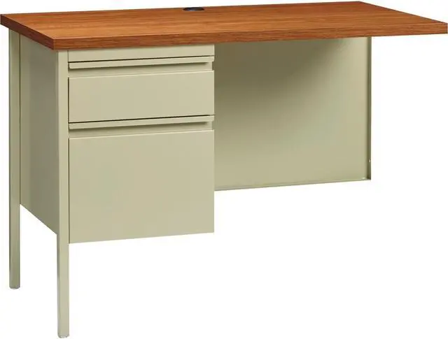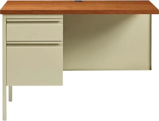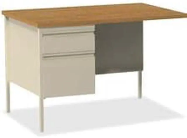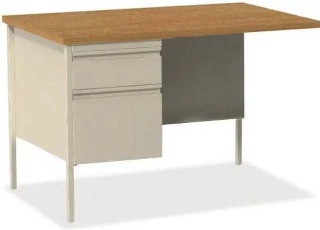 Fortress Series Desking offers a practical and professional desk solution ideal for business, government and educational offices. Durable, high-performance steel construction withstands rigorous daily use. The 1-1/8" thick top with square edges features an Oak laminate surface that is scratch-resistant, stain-resistant and water-resistant. Desks are also equipped 3/4 modesty panels and box/file pedestals with full-extension, ball-bearing slides and a locking center drawer. Integrated drawer pulls are full-width. Central-locking center drawer on desks include a core-removable lock. Reinforced, double-frame inner structure keeps desk solid and sturdy for years of use. Steel desking meets or exceeds ANSI/BIFMA standards. Each unit is sold separately.