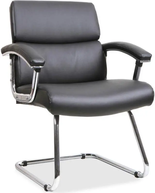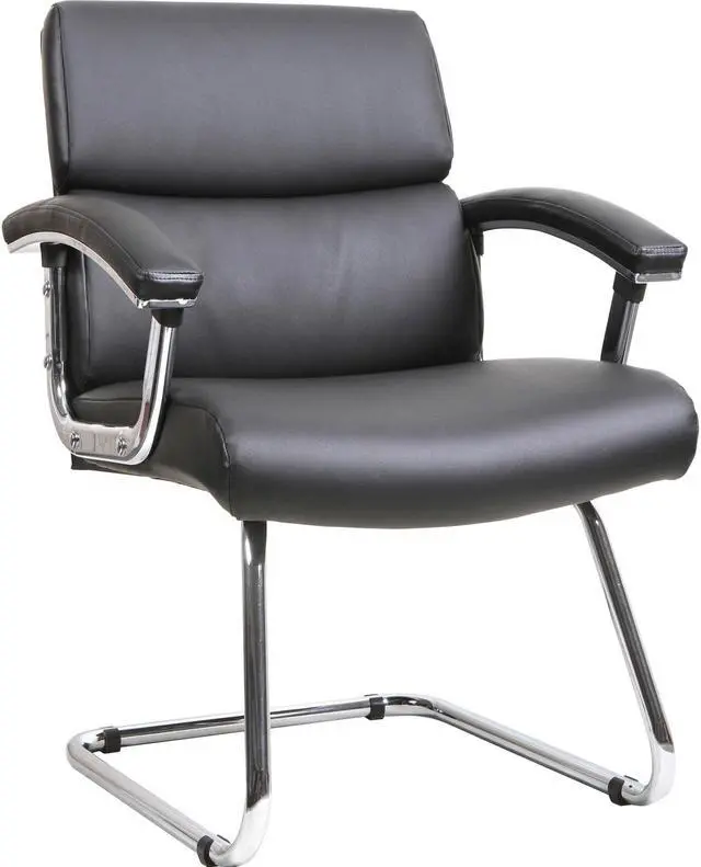 Fixed chrome steel arms with soft upholstery pad Steel sled base for lasting durability Bonded leather for a professional look Thickly cushioned seat for deluxe comfort