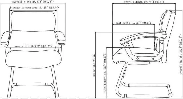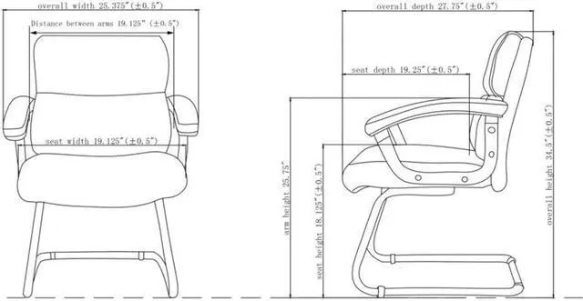 Guest chair features bonded leather upholstery over thickly cushioned seating for deluxe comfort and style. Fixed chrome steel arms also feature a soft upholstery pad. Sled base is made of steel with a shiny chrome finish. Weight capacity is 250 lb. Seat measures 19-1/8" wide x 17-3/4" deep x 18-1/8" high. Back dimensions are 20-1/14" wide x 22-1/4" high.
