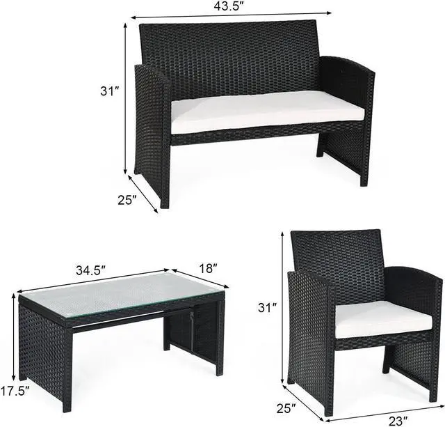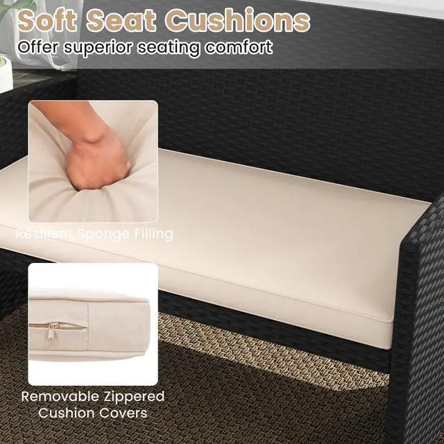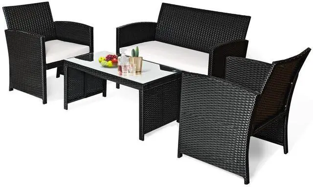 It's time to replace the outmoded outdoor furniture with our modern 4-piece patio wicker sofa and table set. Featuring with classic style and high-quality materials, our patio rattan set are ensured to last long. The softly cushioned wicker patio sofa set chairs are for maximum comfort and excellent seating experience. Powder-coated steel and anti- faded PE wicker provide sturdiness and durability to this patio furniture set. If the cushions get dirty by accident, you can simply zip off the cover and wash the covers. Besides, the coffee tabletop is made of tempered glass, so you can wipe it off with damp cloth. This set of rattan furniture can be placed in your courtyard, balcony and poolside for you to have a gathering or conversation with drinks and food. So make this furniture set yours and be sure to share the best of times with your dear ones.