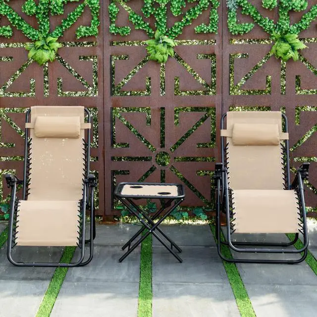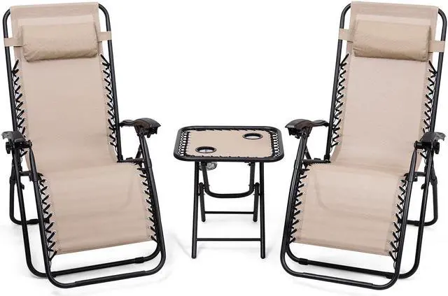 This is our brand new zero gravity chairs table set which include two zero gravity lounge chairs and one portable folding table. Be made of steel construction and all-weather fade resistant textilene fabric, these chairs include a headrest pillow are designed with comfort and durability in mind. You can adjust the back to fits your body and give you the best comfort for its incline and adjustable back. The portable folding table with 2 cup holders, you can enjoy the tea when you lie on the lounge chair, it is a best choice to your backyard, patio, campsite, cabin or beach house. Don't hesitate to buy one!