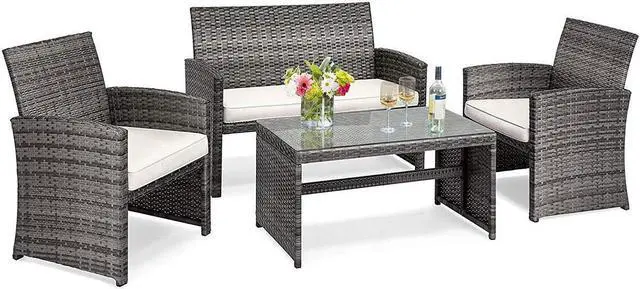 The most stylish rattan wicker furniture gives your garden a new look. Our 4 piece rattan furniture includes one bench, two single sofas and a coffee table with tempered tabletop. Our patio rattan set made of premium steel and rattan that are ensured to last long. The thickly cushioned patio sofa set chairs for maximum comfort and excellent seating experience. If the cushions get dirty, you can simply zip off the cushions covers and wash the covers. Besides, the table top is made of tempered glass, so you can wipe it off with damp cloth. This set of rattan furniture can be placed in your courtyard, balcony and poolside to have a gathering or conversation with drinks.