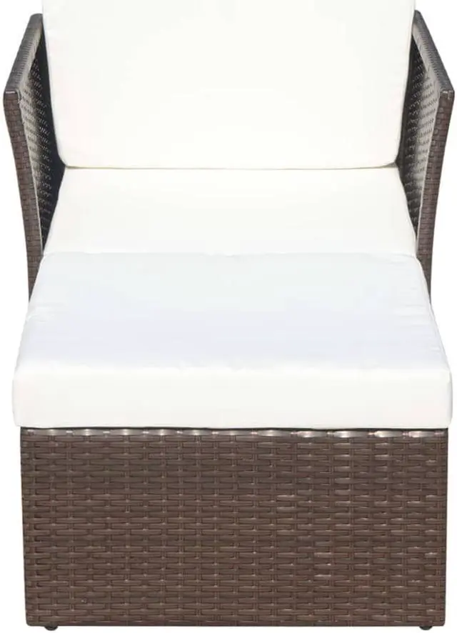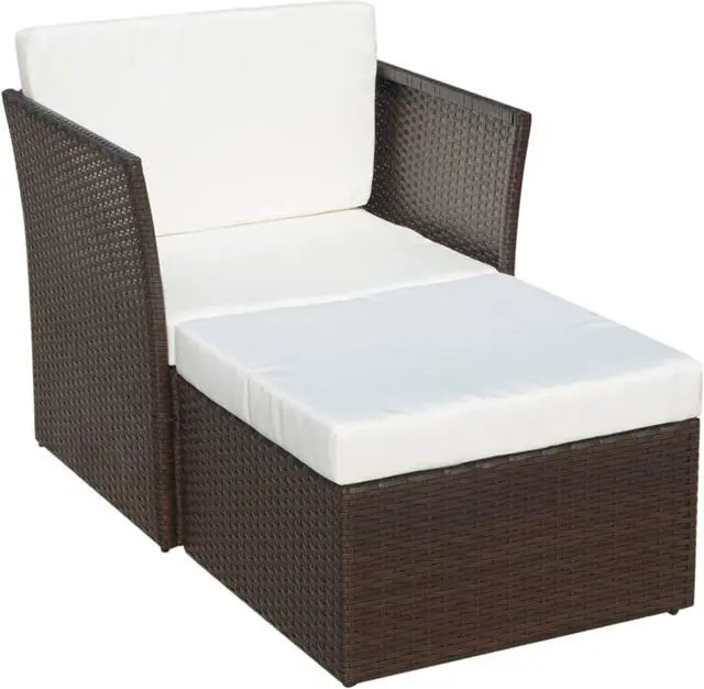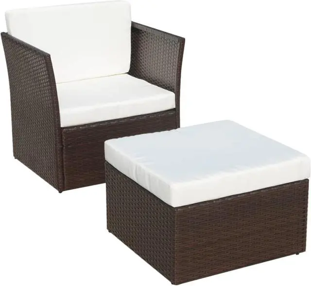 This stylish and functional rattan chair set will become the focal point of your garden or patio. It is perfect for indoor and outdoor use year-round. The chair is constructed from sturdy powder-coated steel and high-quality PE rattan, which is highly durable. The thick, removable cushions are highly comfortable. Delivery includes 1 chair, 1 footstool, 1 back cushion and 2 seat cushions.
