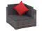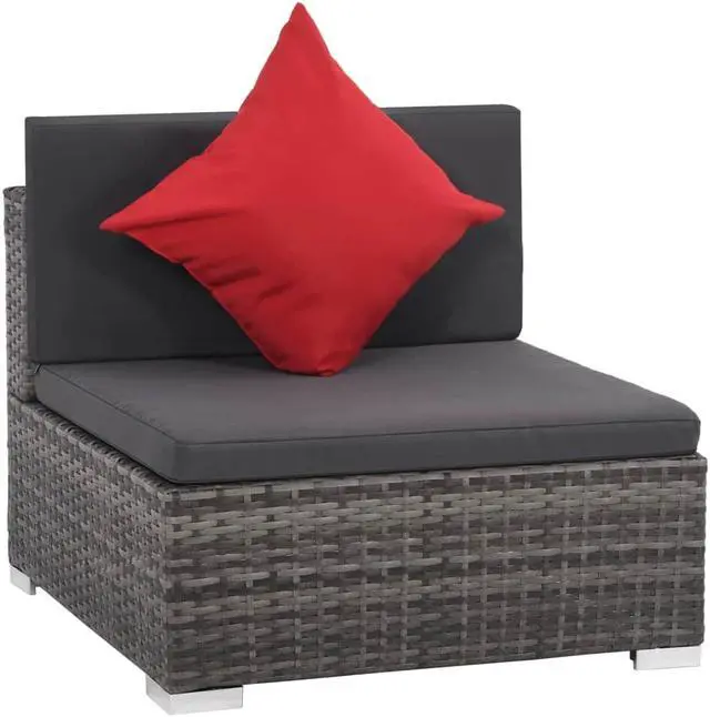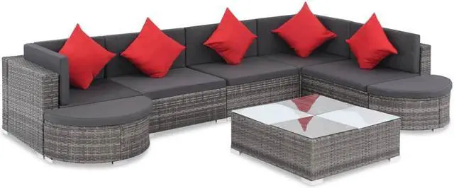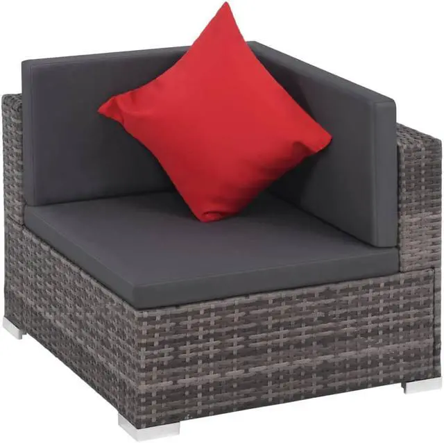 This poly rattan sofa set, consisting of 2 corner sofas, 3 center sofas, 1 coffee table, 2 half-round stools, 5 eye-catching red pillows and 14 cushions, will offer a stylish seating area for your garden or patio. Thanks to the water-resistant PE rattan, the patio sofa set is easy to clean, hard-wearing and suitable for daily outdoor use. The powder-coated steel frames make the set sturdy and stable. It is lightweight and the modular sections can be easily combined into different configurations. This set is also delivered with the highly comfortable, thickly-padded seat cushions and back pillows for the ultimate comfort.