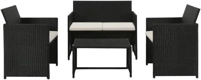 Our poly rattan sofa set combines style and functionality, and will be the focal point of your garden, patio or terrace. Thanks to the weather-resistant and waterproof PE rattan, our patio lounge set is easy to clean, hard-wearing and suitable for daily use. The patio sofa set features a sturdy, powder-coated steel frame which is highly durable. It is also lightweight, making it easy to move around. Thick, removable seat cushions are included to provide the utmost seating comfort. Our modular poly rattan lounge set can be easily moved around to suit any setting! Delivery includes 1 two-seater sofa, 1 coffee table, 2 single sofas and 4 seat cushions.