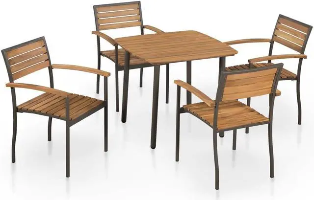 Enjoy a nice meal outdoors with your family and friends with our wooden patio dining set! The patio dining set will bring a touch of rustic charm to your patio, garden or terrace. The table and chairs are made of solid acacia wood with an oil finish and have a slatted design. The steel frames make them sturdy and stable, and give them an industrial look. The chairs can be stacked to save space when not in use. The dining set is easy to assemble and maintain. Delivery includes 1 table and 4 stacking chairs.