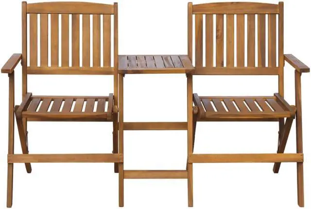 This classic wooden patio bench with a tea table combines style and functionality and will add a touch of rustic charm to your garden, patio, pool deck or other patio living space. This bench is made of durable, solid acacia wood, which has been finished with a natural oil coating and is characterized by its excellent weather resistance. Therefore, it is extremely suitable for outdoor use. This patio bench seats up to 2 persons. Its seat and backrest slats offer great support and seating comfort, and it has two comfortable armrests.