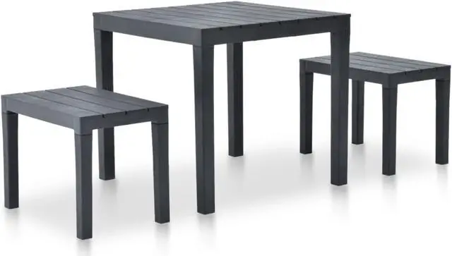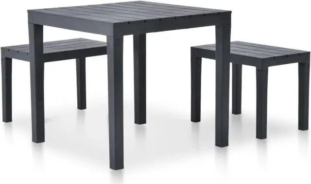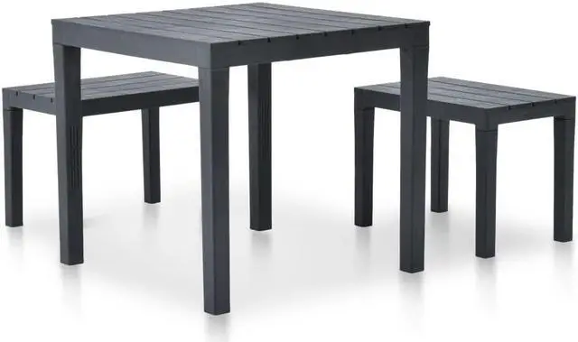 Enjoy the outdoor lounging or dining time with your friends or family members with our garden set! This garden set is made of durable, weather resistant and maintenance free plastic, which is hard-wearing and suitable for daily use. Benches with wide seats ensure enough space for your family and friends. No assembly is required. Delivery includes 1 table and 2 matching benches.