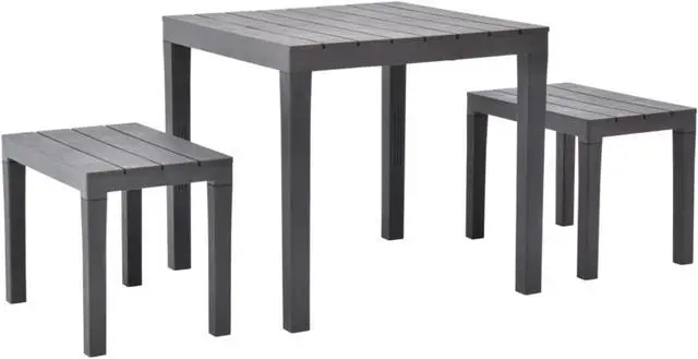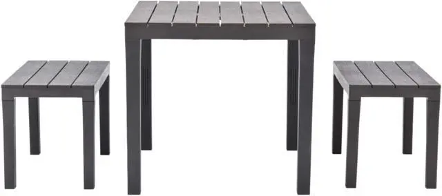 Enjoy the outdoor lounging or dining time with your friends or family members with our garden set! This garden set is made of durable, weather resistant and maintenance free plastic, which is hard-wearing and suitable for daily use. Benches with wide seats ensure enough space for your family and friends. No assembly is required. Delivery includes 1 table and 2 matching benches.