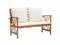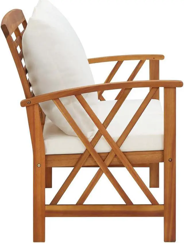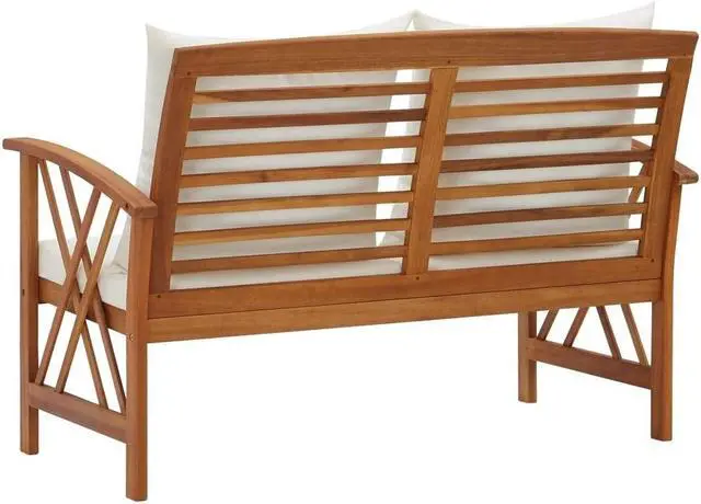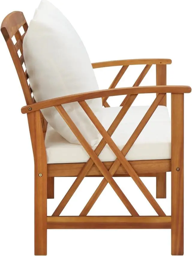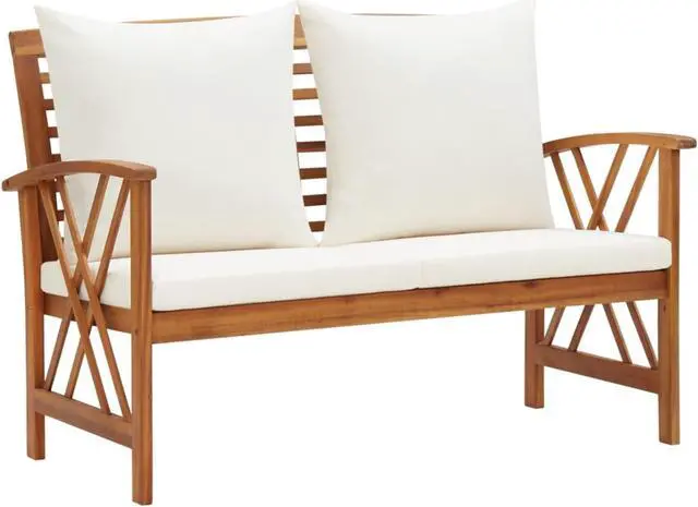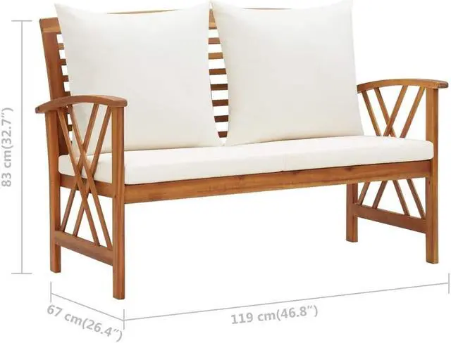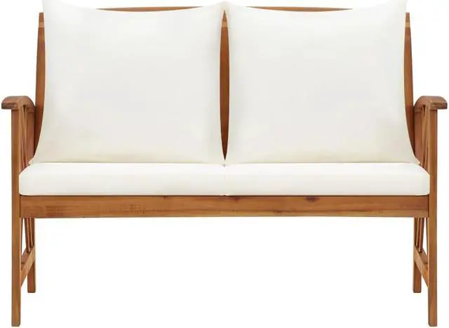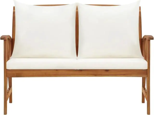 This simplistic patio bench with cushions is perfect for you to enjoy the fine weather and relax in your garden or patio. This outdoor bench is made of solid acacia wood, a hardwood with dense grains. The beautifully-designed bench is stable, durable and eye-catching. The oil-finished surface is easy to clean with a damp cloth, and suitable for outdoor use. The included seat cushions and back pillows provide optimal seating comfort. The wooden bench makes it an ideal place for relaxing, chatting with your family members in your garden, patio or balcony.