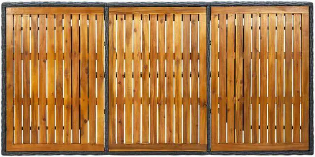 This poly rattan patio table adds a touch of modern elegance to your outdoor living space with its simplistic yet stylish design. Thanks to the round PE rattan, this outdoor table is easy to clean and durable to use. The powder-coated steel frame and solid acacia wood tabletop also make the table sturdy and stable. The solid tabletop is perfect for placing or displaying your various essentials. Additionally, this dining table is easy to move with the lightweight construction.