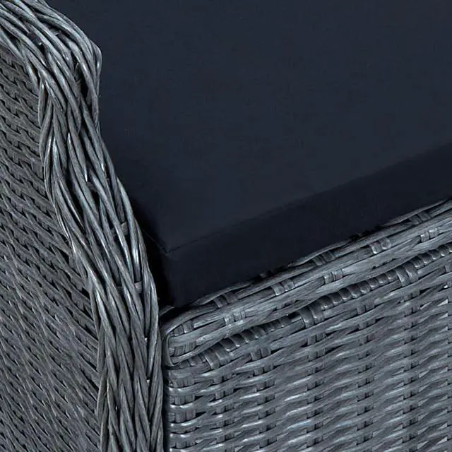 The furniture set is made of lightweight and low-maintenance round PE rattan, making it perfect for outdoor use, easy to clean with a damp cloth. Thanks to its powder-coated steel frame, the armchairs and table are stable and durable. The solid acacia wood tabletop is perfect for having dinner or placing decorative items. The reclining chair with thick cushions provides an exceptionally comfortable and enjoyable place to relax. The cushion cover is equipped with a zip, removable and washable. Thanks to the gas lift mechanism, the backrest is also adjustable to fit your positions. By touching the button on the side, the backrest can recline, for a comfortable lying position. The chair is perfect for relaxing in and putting your feet up with a matching footstool. You can also place it anywhere as per your preference.