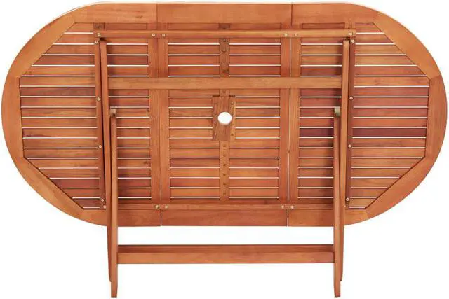 - The dining table is made of solid eucalyptus wood, which is weather-resistant and highly durable. The oil-finishing keeps a smooth appearance, making it easy to clean with a damp cloth. The table can be folded away to save space when not in use.