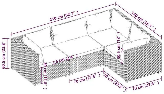 - Corner/Middle sofa dimensions (each): 27.6" x 27.6" x 23.8" (L x W x H)
