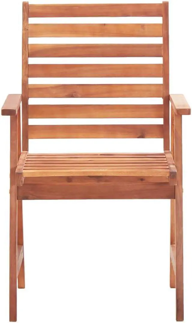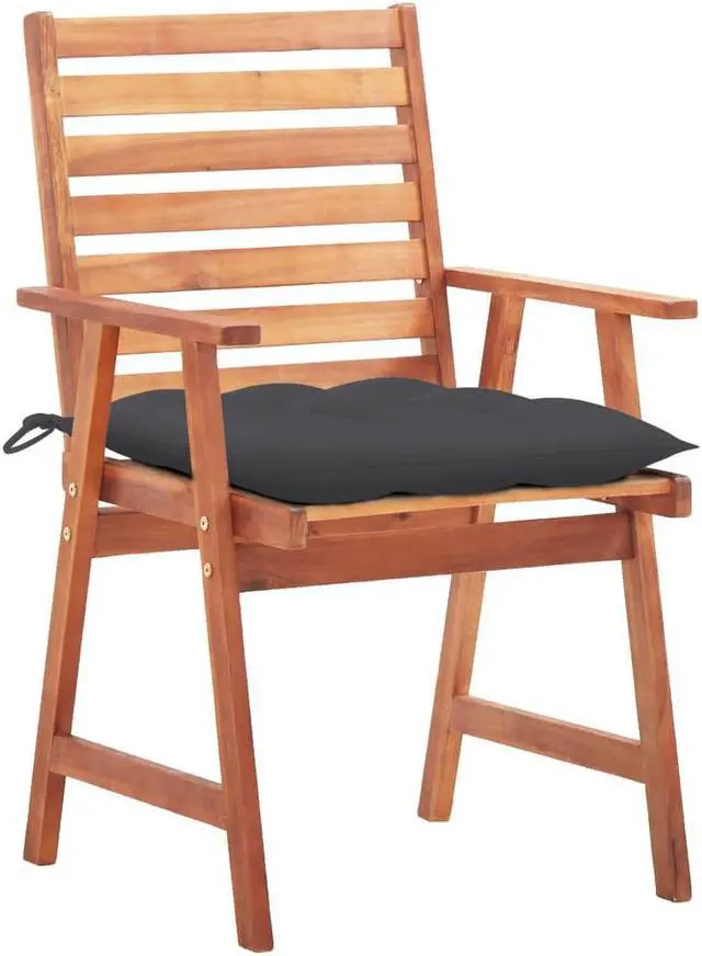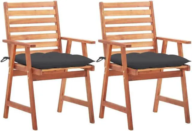 These garden chairs are made of solid acacia wood, a tropical hardwood, which is weather-resistant and durable for years of use. The oil finished surface is easy to clean with a damp cloth. The slatted design will bring a rustic charm. What's more, the included cushions provide extra comfort while seating. It is made of 100% polyester that has been treated to make it waterproof. Each cushion has two sets of ropes to fix it on the chair tightly.