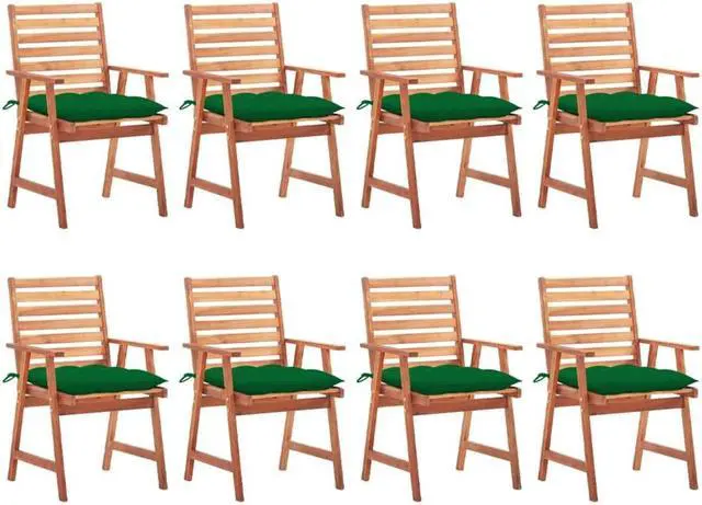 These garden chairs are made of solid acacia wood, a tropical hardwood, which is weather-resistant and durable for years of use. The oil finished surface is easy to clean with a damp cloth. The slatted design will bring a rustic charm. What's more, the included cushions provide extra comfort while seating. It is made of 100% polyester that has been treated to make it waterproof. Each cushion has two sets of ropes to fix it on the chair tightly.