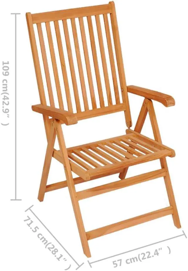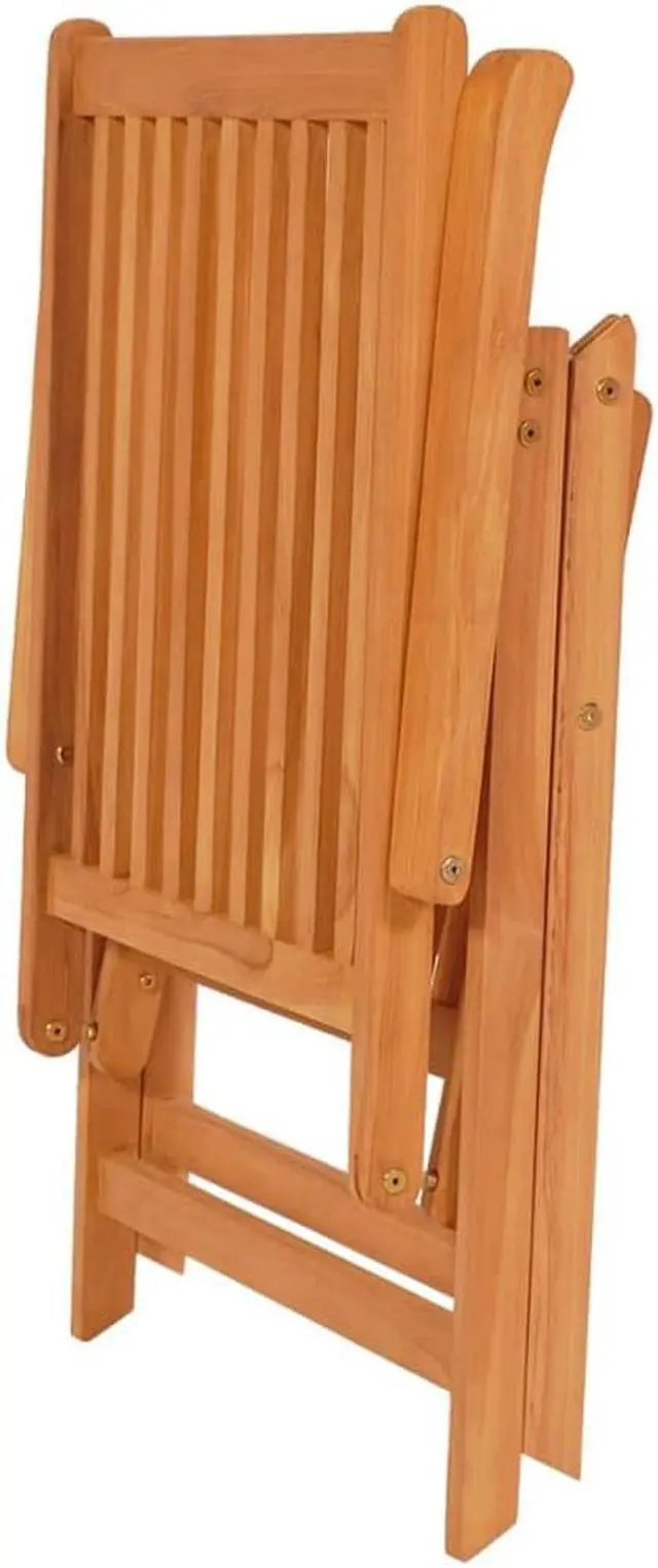 The folding and reclining wooden chair has a classic design. Constructed from extremely durable teak hard wood, this piece of teak furniture has been seasoned, kiln dried and then fine sanded to give a very smooth appearance. Teak wood is known for its exceptional strength and weather resistance, making it far more suitable for patio furniture than any other kind of wood. Teak wood is the perfect choice if you want to purchase a long lasting piece of patio furniture. The armchair's backrest can be adjusted in 7 reclining settings, so you can always find the most comfortable position. It is also lightweight, which makes it easy to move around. The dining chair can be folded to save space when not in use. What's more, the included cushions provide extra comfort. Each cushion has an elastic band and two sets of ropes to fix it on the chair tightly.