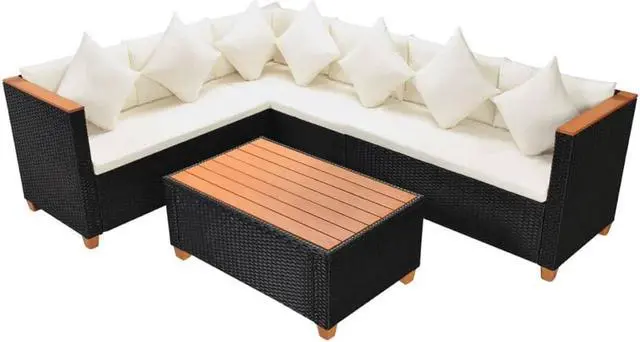 The cushion covers are removable and washable. The sturdy tabletop and armrest tops are made of durable WPC. Delivery includes two 2-seater sofa segments (each with one armrest), one corner sofa segment, one coffee table, seven pillows, seven back cushions, and three seat cushions.