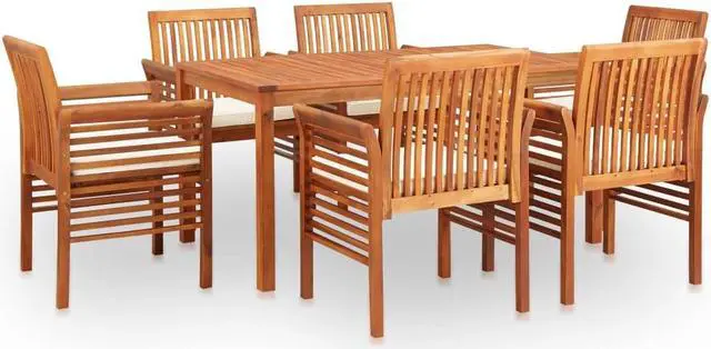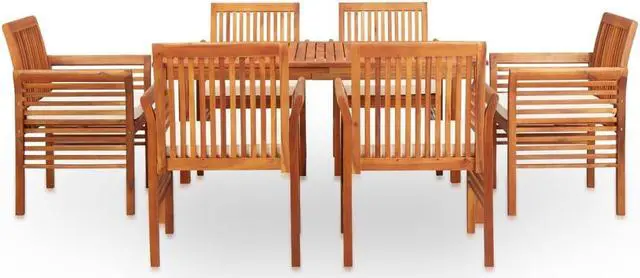 Give your patio or backyard space a beautiful natural look with our simple yet elegant seven-piece wooden dining set. You can easily enjoy a nice meal outdoors with your beloved family members and friends! The table and chairs are made of solid acacia wood with an oil finish and have a slatted design, which is weather resistant and suitable for outdoor use. The oil-finished surface is also easy to clean. Equipped with cozy foam pads, you can spend all lounging outdoors in great comfort. When not in use, you can cover or store the set to prolong its lifespan. Delivery includes 1 dining table and 6 dining chairs.