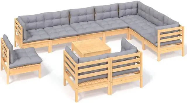 vidaXL Solid Pinewood Patio Lounge Set 11 Piece with Gray Cushions Garden Sofa