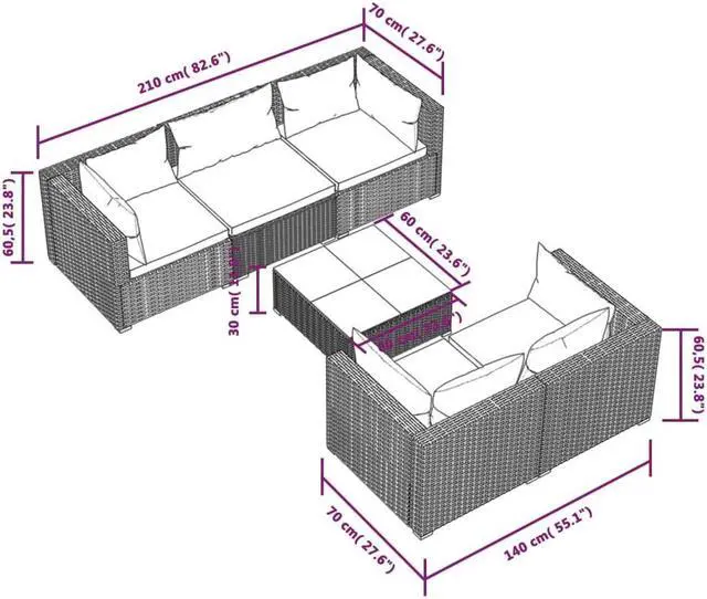 - Middle/Corner sofa dimensions (each): 27.6" x 27.6" x 23.8" (L x W x H)