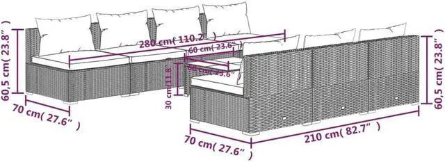 - Middle sofa dimensions (each): 27.6" x 27.6" x 23.8" (L x W x H)
