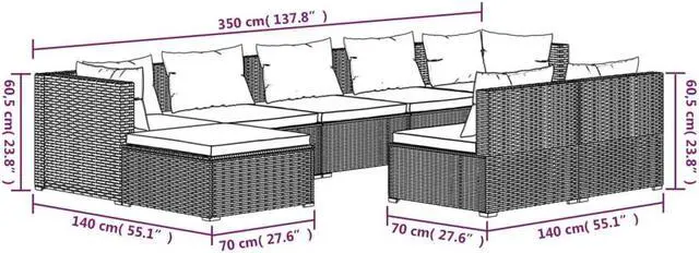 - Dimensions of each middle sofa: 27.6" x 27.6" x 23.8" (L x W x H)