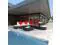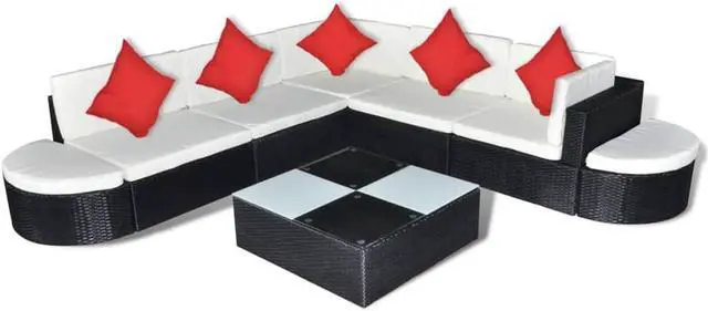 Delivery includes 2 corner sofas, 3 center sofas, 2 ottomans, 1 tea table, 5 red pillows, 7 seat cushions and 7 back cushions.