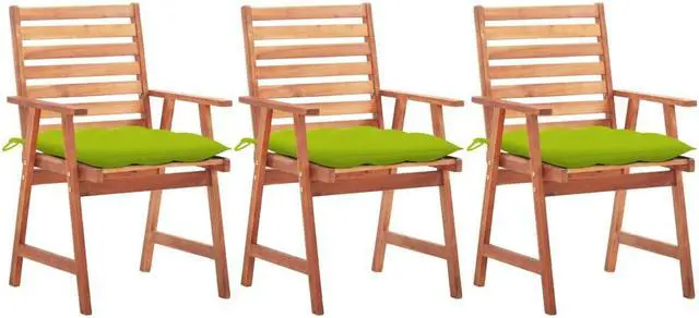 This contemporary wooden dining chair set with cushions will add a touch of natural style to your garden, terrace or patio. This wooden chair set will be a great choice for al fresco dining. These patio chairs are made of solid acacia wood, a tropical hardwood, which is weather-resistant and durable for years of use. The oil finished surface is easy to clean with a damp cloth. The slatted design will bring a rustic charm. What's more, the included cushions provide extra comfort while seating. It is made of 100% polyester that has been treated to make it waterproof.