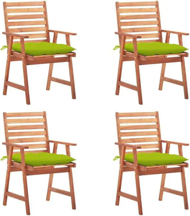 This contemporary wooden dining chair set with cushions will add a touch of natural style to your garden, terrace or patio. This wooden chair set will be a great choice for al fresco dining. These garden chairs are made of solid acacia wood, a tropical hardwood, which is weather-resistant and durable for years of use. The oil finished surface is easy to clean with a damp cloth. The slatted design will bring a rustic charm. What's more, the included cushions provide extra comfort while seating. It is made of 100% polyester that has been treated to make it waterproof.