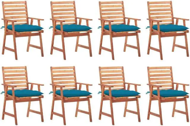 This contemporary wooden dining chair set with cushions will add a touch of natural style to your garden, terrace or patio. This wooden chair set will be a great choice for al fresco dining. These garden chairs are made of solid acacia wood, a tropical hardwood, which is weather-resistant and durable for years of use. The oil finished surface is easy to clean with a damp cloth. The slatted design will bring a rustic charm. What's more, the included cushions provide extra comfort while seating. It is made of 100% polyester that has been treated to make it waterproof.