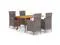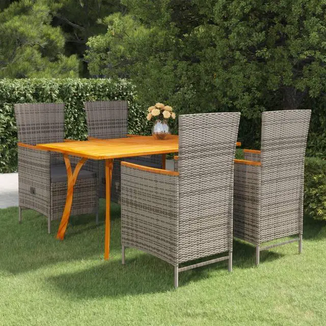 Create a compelling and cohesive aesthetic in your patio space with this patio dining set! This patio table is made of solid acacia wood, making it sturdy and stable. The oil-finished surface also makes the table easy to clean with a damp cloth. Additionally, the curved legs contribute to its stylish design. Featuring a steel frame covered with weather-resistant PE rattan, these dining chairs are sturdy and easy to clean. The thickly padded cushions add comfort in your lounging time.