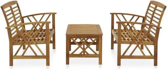 The wooden garden lounge set adds a vintage look and is specially designed for your garden, patio or other outdoor living space! The outdoor furniture set is built from a solid acacia wood construction with an oil finish, making it stable and durable. Thanks to the solid wood tabletop with slatted design, the coffee table offers you space to put your snacks, fruit baskets, decorative items, as well as other essentials. The slightly curved backrest and the armrests add the bench's seating comfort.