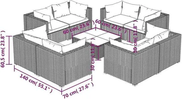 Corner sofa dimensions (each): 27.6" x 27.6" x 23.8" (L x W x H)
