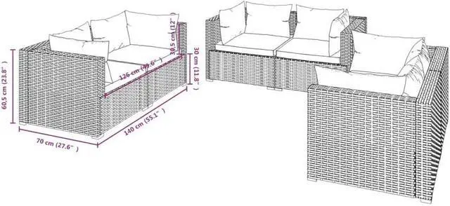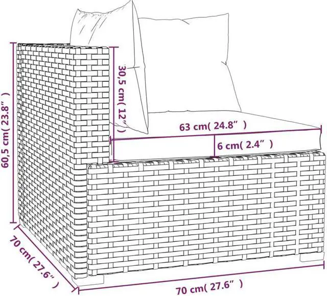 Dimensions of each middle sofa: 27.6" x 27.6" x 23.8" (L x W x H)