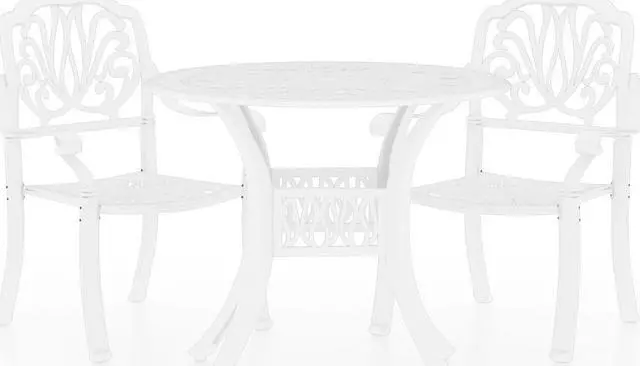 This patio bistro set, made of cast aluminum, provides a comfortable seating experience for you and your guests. The outdoor chairs and table, made of cast aluminum, are both sturdy and durable. The rust-resistant and weather-resistant material makes the furniture set ideal for outdoor use. The beautiful patterns make the bistro set an elegant addition to your outdoor space. Additionally, the coffee table has an umbrella hole that can perfectly accommodate your umbrella to protect you from sun or rain.