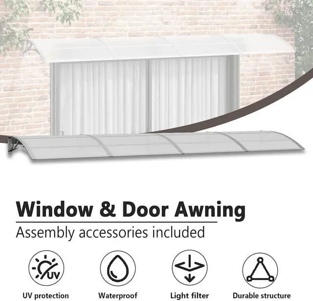 This Door Canopy is made for outdoor durability and modern style, giving you top-notch protection against all sorts of weather while sprucing up your home entrance. With its smooth, semi-opaque polycarbonate surface and tough ABS and aluminum components, it keeps doorways safe from rain and snow, adding a trendy touch to patios, front doors, and back doors.