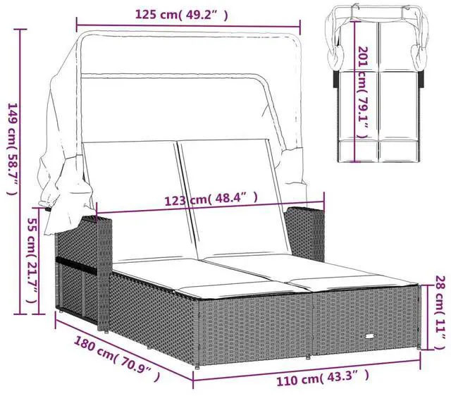 Dimensions with canopy: 43.3" x 70.9" / 79.1" x 58.7" (W x D x H)