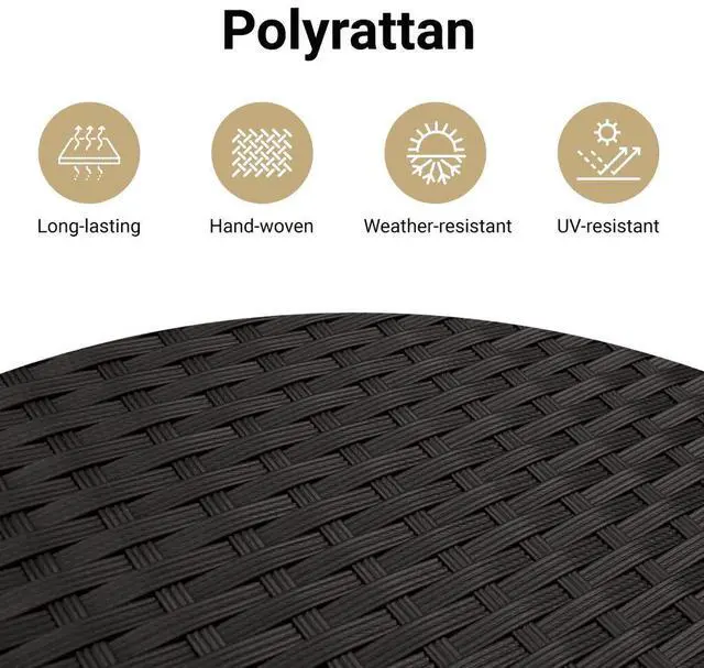 Durable material: PE rattan, also known as poly rattan, is a strong, low-maintenance synthetic material that looks like natural rattan. It's lightweight, easy to clean, and commonly used for outdoor furniture due to its durability and weather-resistant properties.