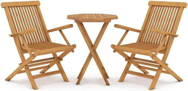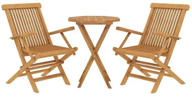 This compact 3 piece garden dining set combines elegance and practicality, perfect for maximizing your outdoor space. Made from solid teak wood, it has a lovely natural look that suits any patio or balcony, letting you enjoy meals or special moments in your garden.
