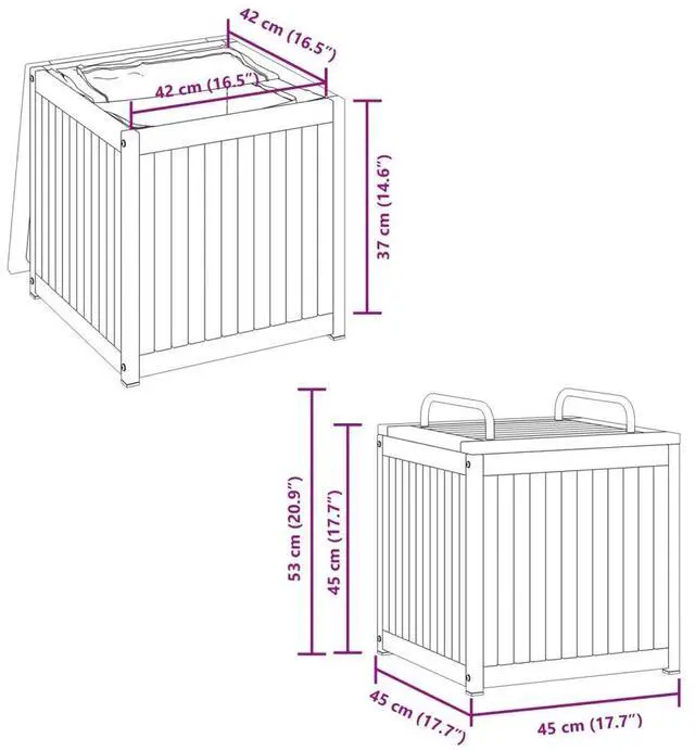 This outdoor cushion box is made from solid acacia wood and finished for both looks and protection from the elements. At 17.7 x 17.7 x 20.9 in, it fits easily into any garden, patio, or balcony while giving you a great storage solution for cushions, toys, and more.