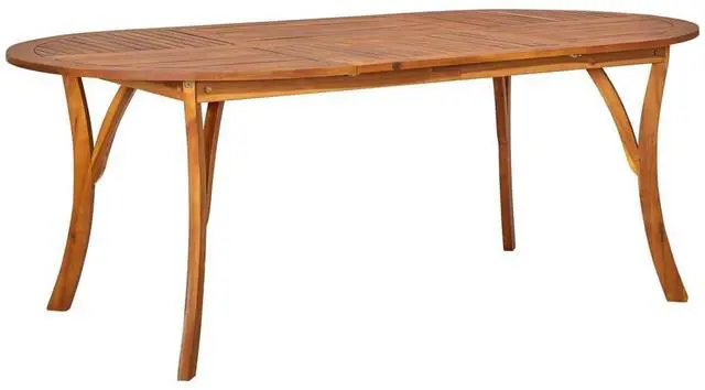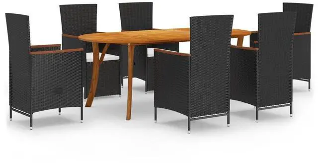 This patio table is made of solid acacia wood, making it sturdy and stable. The oil-finished surface also makes the table easy to clean with a damp cloth. Additionally, the curved legs contribute to its stylish design. Featuring a steel frame covered with weather-proof PE rattan, these dining chairs are sturdy and easy to clean. The thickly padded cushions add comfort in your lounging time.