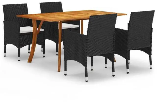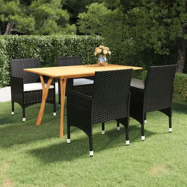 This 5-Piece Contemporary Garden Dining Set is a stylish addition to any outdoor space, perfect for casual hangouts or fancy meals. It features a spacious rectangular table made from solid acacia wood along with four matching chairs made from weather-resistant PE rattan, giving you both style and practicality in one lovely package.