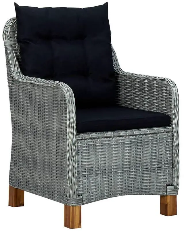 This patio table is made of solid acacia wood, making it sturdy and stable. The oil-finished surface also makes the table easy to clean with a damp cloth. Additionally, the curved legs contribute to its stylish design. Featuring a steel frame covered with weather-proof PE rattan, these dining chairs are sturdy and easy to clean. The thickly padded cushions add comfort in your lounging time.