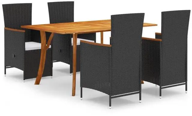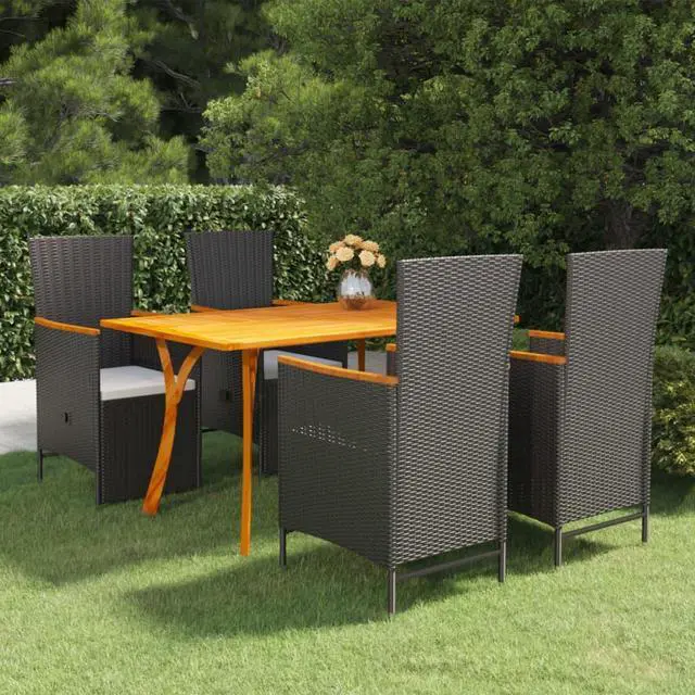 This patio table is made of solid acacia wood, making it sturdy and stable. The oil-finished surface also makes the table easy to clean with a damp cloth. Additionally, the curved legs contribute to its stylish design. Featuring a steel frame covered with weather-proof PE rattan, these dining chairs are sturdy and easy to clean. The thickly padded cushions add comfort in your lounging time.