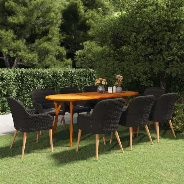 This patio table is made of solid acacia wood, making it sturdy and stable. The oil-finished surface also makes the table easy to clean with a damp cloth. Additionally, the curved legs contribute to its stylish design. Featuring a steel frame covered with weather-proof PE rattan, these dining chairs are sturdy and easy to clean. The thickly padded cushions add comfort in your lounging time.
