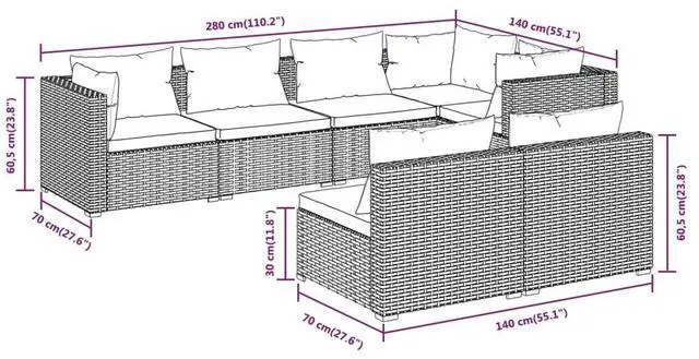 Delivery Contains: 3 Corner sofas, 4 Middle sofas, 7 Seat cushions, 10 Back pillows