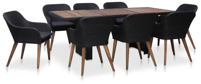 This 9 Piece Outdoor Dining Set is styled for both looks and practicality. It's the perfect add-on for any garden or patio. Made from durable materials, it features eight cushioned chairs around a big rectangular table, creating a welcoming space for family and friends to enjoy meals in the fresh air.