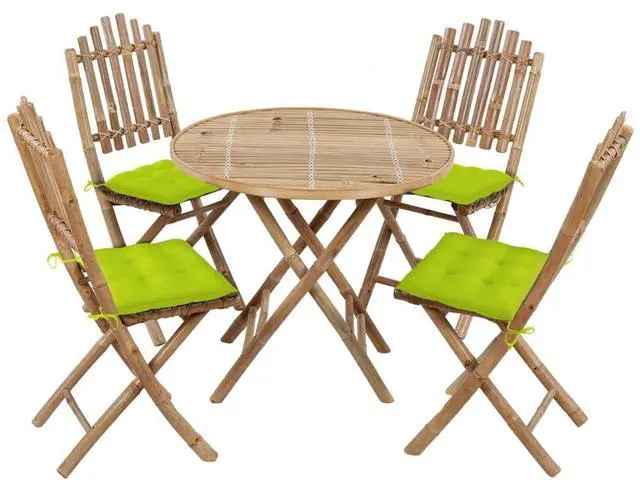 This 5-Piece Folding Patio Dining Set turns any balcony or outdoor area into a welcoming dining spot, mixing comfort with practicality in its rustic style. Made from bamboo fiber, it brings a warm, natural touch that looks lovely with the bright green cushions, organizing an outdoor retreat thats perfect for family get-togethers or cozy dinners.